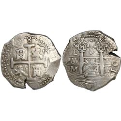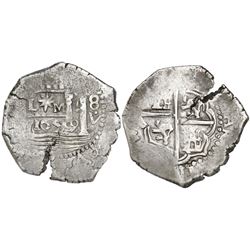 Potosi, Bolivia, cob 8 reales, Philip II, assayer B (3rd period, late variety). S-P10; KM-5.1; CT-158. 26.94 grams. VF with traces of luster but some