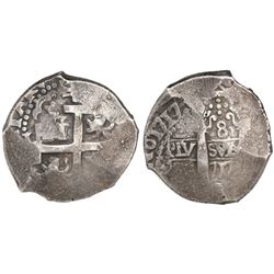 Potosi, Bolivia, cob 8 reales, Philip II, assayer B (1st period, "Lima style"). S-P4; KM-5.1; CT-139 (under Lima). 24.83 grams. Full legen...
