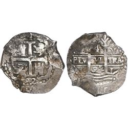 Potosi, Bolivia, cob 8 reales, Philip II, assayer B (5th period). S-P14; KM-unl; CT-unl. 27.14 grams. VF with full P-B, good full shield and cross and