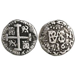 Lima, Peru, cob 1 real, Philip II, assayer X, very rare. S-L3; KM-unl; CT-unl. 3.29 grams. Choice full shield and cross, bold full denomination I to