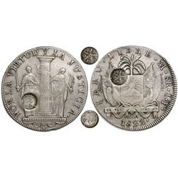Guatemala, 8 reales, sun-over-mountains double countermark (Type IV, 1841) on a Lima, Peru, provisional 8 reales, 1822JP, "Peru Libre" (ra...