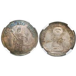 Peru, 1/2 peso-sized silver medal, 1828, congressional approval of Constitution, encapsulated NGC MS 62, finest and only specimen in NGC census. Fonro