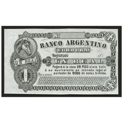 1501 - Cordoba, Argentina, El Banco Argentino, 1 real plata boliviana remainder, 187X.Sedwick & Associates, LLC