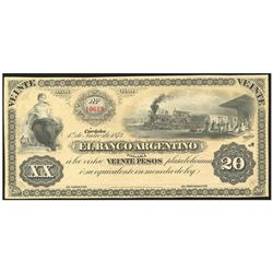 Argentina, El Banco Argentino, 20 pesos plata boliviana remainder, 1-7-1873, series A, serial 10619. Pick-S1482. AU note with a slight fold in lower