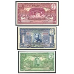 Lot of 3 Paraguay notes: Banco Central del Paraguay, 1,000 guaranies, 25-3-1952, series A, serial 1476289; Banco del Paraguay, 500 guaranies, 5-10-194