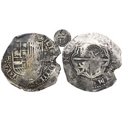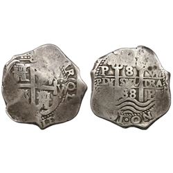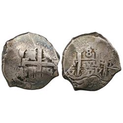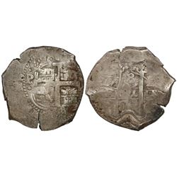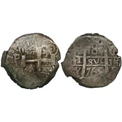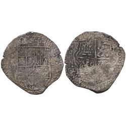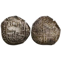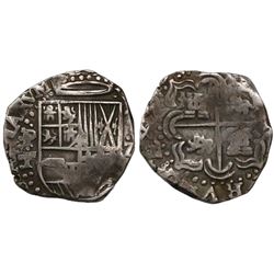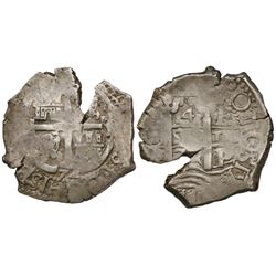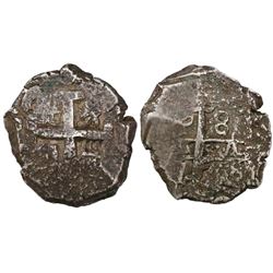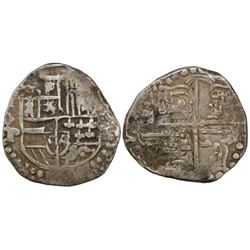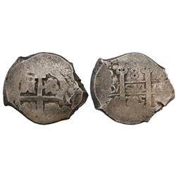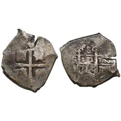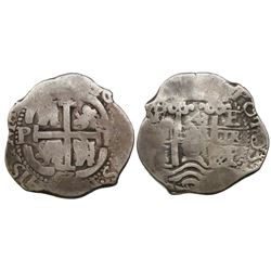 Potosi, Bolivia, cob 2 reales, Philip IV, assayer T (1630s). S-P26; KM-14a. 6.83 grams. Uneven flan with most of shield and cross and crown, full P-T,