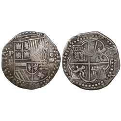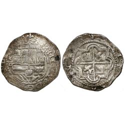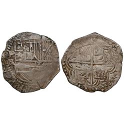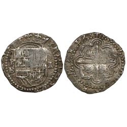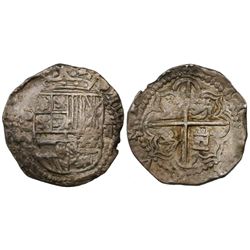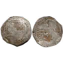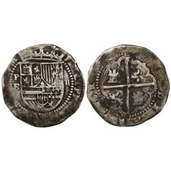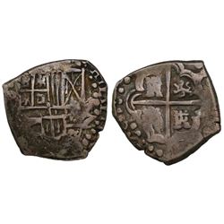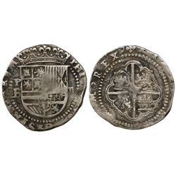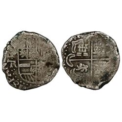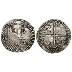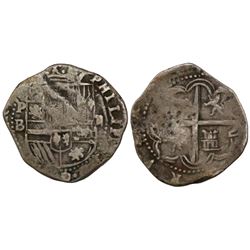 Potosi, Bolivia, cob 2 reales, Philip II, assayer B (4th period). S-P12; KM-3.2. 6.38 grams. Bold P-B and PHILIP in legend, full but partially flat cr