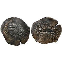 Potosi, Bolivia, cob 4 reales, Philip II, assayer B (2nd period). S-P6; KM-4.2; CT-Type 229. 13.37 grams. Full but partially flat shield and cross, fu