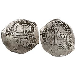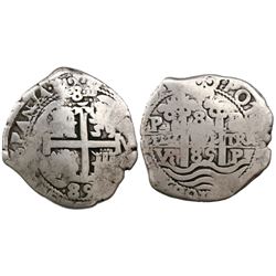 Potosi, Bolivia, cob 8 reales Royal, 1687VR. S-P40; KM-R26; CT-325. 24.22 grams. Worn (VG) but with all details clear and amazingly unholed, toned on
