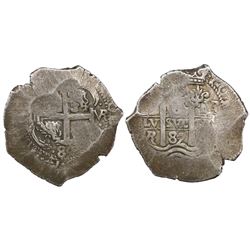 Potosi, Bolivia, cob 4 reales, 1672E. S-P37b; KM-25; CT-497. 13.05 grams. Uneven AVF with bold waves, full POTOSI, two dates, large edge-crack.