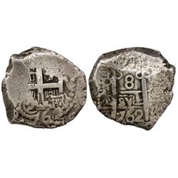 Potosi, Bolivia, cob 8 reales, 1758q. S-P54; KM-40; CT-375. 27.41 grams. Chunky flan with jagged edge (as made), full cross, full but off-center pilla