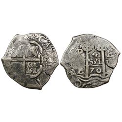 Potosi, Bolivia, cob 4 reales, 1670E. S-P37b; KM-25; CT-495. 12.79 grams. Bold full pillars-and-waves with two dates, off-center cross with full CAROL