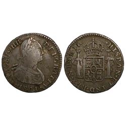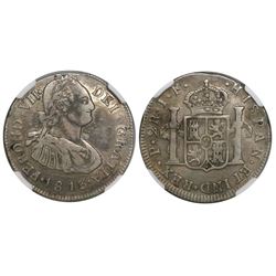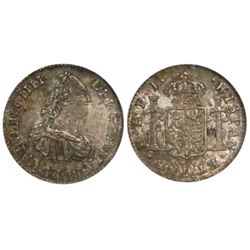 Potosi, Bolivia, bust 1/2 real, Charles IV, 1808PJ, encapsulated NGC MS 62. CT-1352; KM-69. Lightly toned with muted underlying luster, choice.