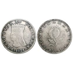 Bogota, Colombia, 8 reales, 1821JF, mintmark BA, encapsulated NGC VF 30. Restrepo-158.2; KM-C6. Bold strike (rare thus) with better rims than normal