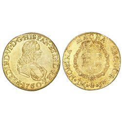 Lima, Peru, bust 8 escudos, Ferdinand VI, 1760JM. CT-29; KM-59.2. 26.92 grams. Cleaned AU with slightly weak center on reverse, nicely detailed bust,