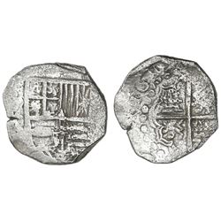 Potosi, Bolivia, cob 8 reales, Philip III, assayer T, quadrants of cross transposed, Grade 2. S-P21; KM-10. 25.35 grams. Small, thick flan with full s