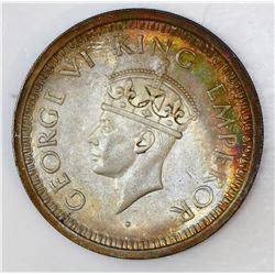 Bombay, India (British), 1 rupee, 1945-(B), regular five. SW-9.32; KM-557. 11.66 grams. Nice UNC, vivid rainbow toning around edges with more silvery