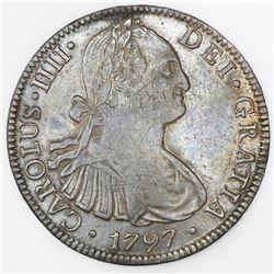 Mexico City, Mexico, bust 8 reales, Charles IV, 1797FM. KM-109; CT-691. 26.92 grams. Toned XF with weak centers, previously cleaned.