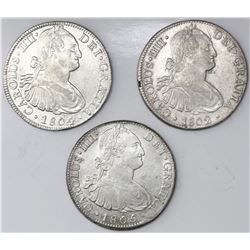 1955 - Lot of three Mexico City, Mexico, bust 8 reales, Charles IV, 1802FT, 1804TH, 1805TH.Sedwick & Associates, LLC