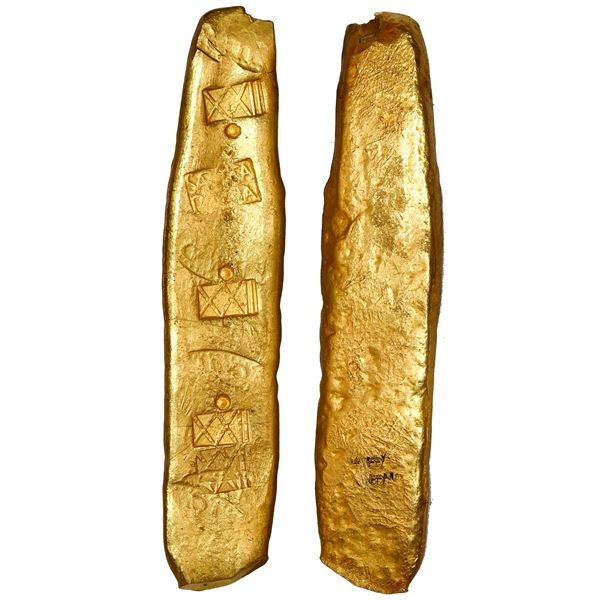 Colombian gold bar, 358 grams, with markings of assayer/foundry SARGOSA / PECARTA, fineness XXII-dot (22.25K), and tax stamps, ex-Atocha (1622). 5&...