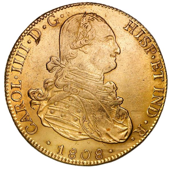 Potosi, Bolivia, gold bust 8 escudos, Charles IV, 1808PJ. Janson-72.20; KM-81; Cal-1714. 27.00 grams. Lustrous UNC with light hairlines on satin surf