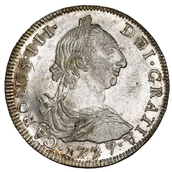 Potosi, Bolivia, bust 8 reales, Charles III, 1777PR, NGC MS 62+. Janson-63.6; KM-55; Cal-1174. Choice luster with incipient toning, no wear and pract