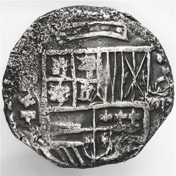 Potosi, Bolivia, cob 8 reales, Philip III, assayer T, quadrants of cross transposed. S-P21; KM-10. 25.49 grams. Salvaged XF details with darkly toned