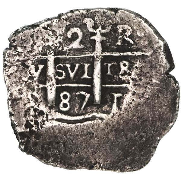 Lima, Peru, cob 2 reales, 1687R. S-L7; KM-21; Cal-344. 6.24 grams. Bold full cross and pillars, two dates, VF+ with flat and slightly porous peripheri