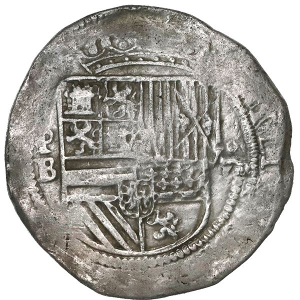 Potosi, Bolivia, cob 8 reales, Philip II, assayer B (5th period). S-P14; Cal-672. 26.69 grams. Bold P-B, full but somewhat weakly struck shield (doubl