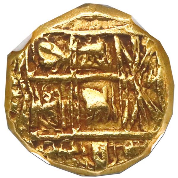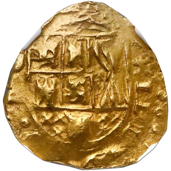 Bogota, Colombia, gold cob 2 escudos, Philip IV, assayer A below mintmark NR to left (ca. 1635), NGC MS 60, ex-Mesuno Treasure (designated on label).