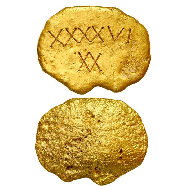 Gold oval ingot, 1126.09 grams, tested at 0.909 fine gold (21.816K), marked with V-over-upside-down-V monogram and XXXXVI, ex-Luz (1752), ex-Sotheby...
