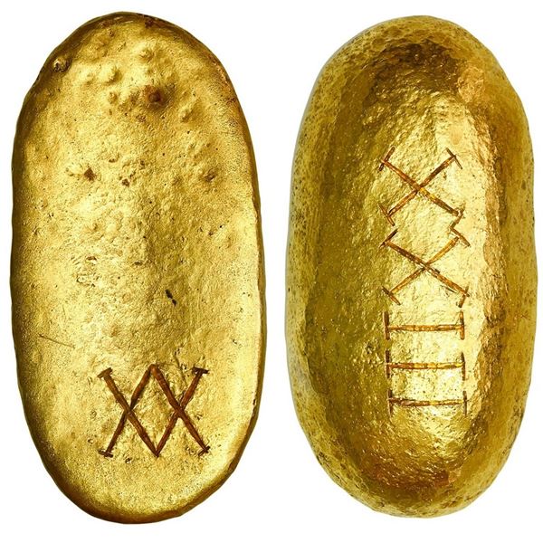 Gold oval ingot, 645.26 grams, tested at 0.819 fine gold (19.656K), marked with V-over-upside-down-V monogram and XXIII, ex-Luz (1752), ex-Sotheby...