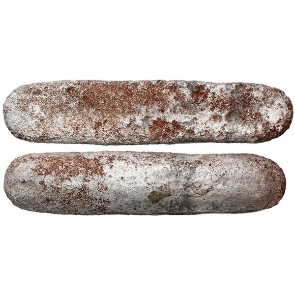 Small silver contraband "finger" bar ingot, 608 grams, mixed fineness (up to 98%), no markings, ex-Maravillas (1656). 5-1/4" x 1-1/4...
