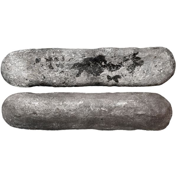 Small silver contraband "finger" bar ingot, 519 grams, mixed fineness (up to 98%), no markings, ex-Maravillas (1656). 5-1/4" x 1-1/4...