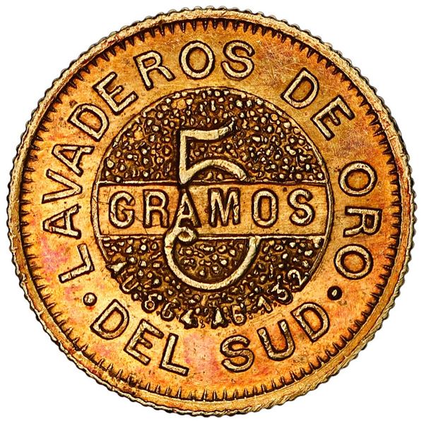 Tierra del Fuego (struck in Buenos Aires), Argentina, gold 5 gramos, Popper, 1889, rare, NGC MS 63. Janson-5; KM-Tn8. Choice luster with light purpli