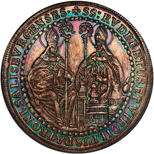 Salzburg, Austria, 1/2 thaler, Johann Ernst, 1694, PCGS MS62. KM-253. Beautifully rainbow toned on reverse (featuring facing seated portraits of sain