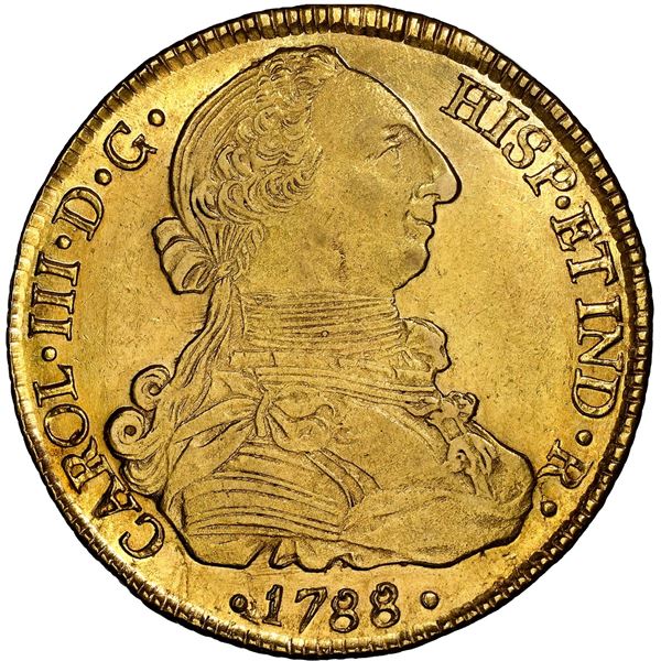 Potosi, Bolivia, gold bust 8 escudos, Charles III, 1788 PR, NGC MS 61. Janson-68.11.1; KM-59; Cal-2075. Choice luster and strike, the reverse virtual
