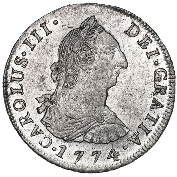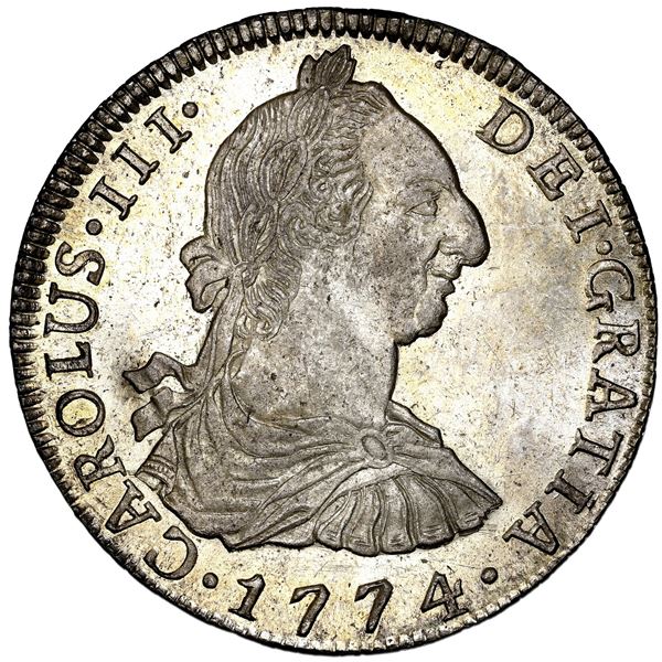 Potosi, Bolivia, bust 8 reales, Charles III, 1774 JR, NGC MS 63+. Janson-63.2; KM-55; Cal-1170. With faint golden toning over highly lustrous fields,