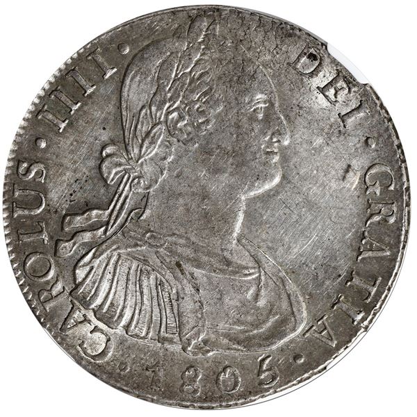 Potosi, Bolivia, bust 8 reales, Charles IV, 1805 PJ, NGC MS 60. Janson-76.17.2; KM-73; Cal-1010. Strong luster for the grade, very lightly gold-toned