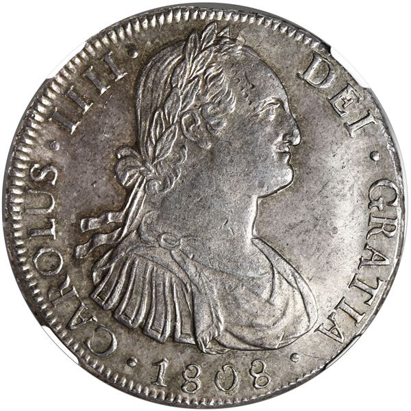 Potosi, Bolivia, bust 8 reales, Charles IV, 1808 PJ, NGC MS 62. Janson-76.20; KM-73; Cal-1014. Well toned over muted luster, with traces of rainbow c