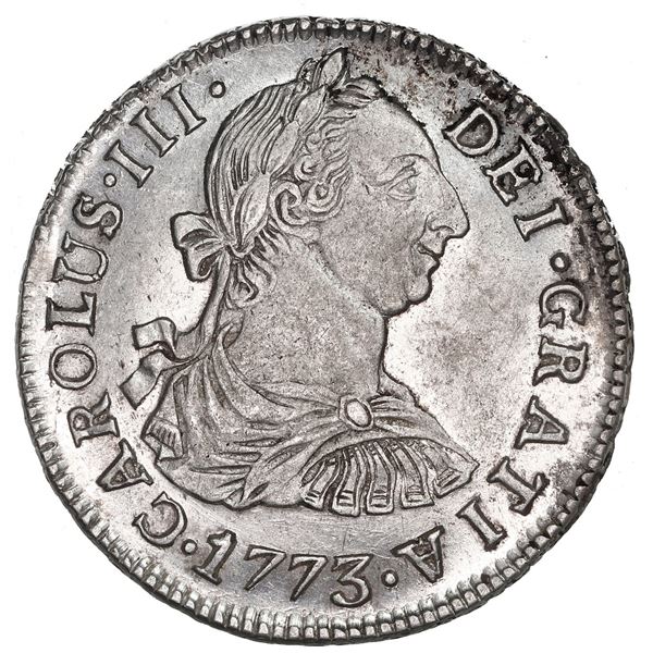 Potosi, Bolivia, bust 2 reales, Charles III, 1773 JR, NGC MS 61, finest known in NGC census. Janson-65.1.1; KM-53; Cal-712. Bold strike with frosty l