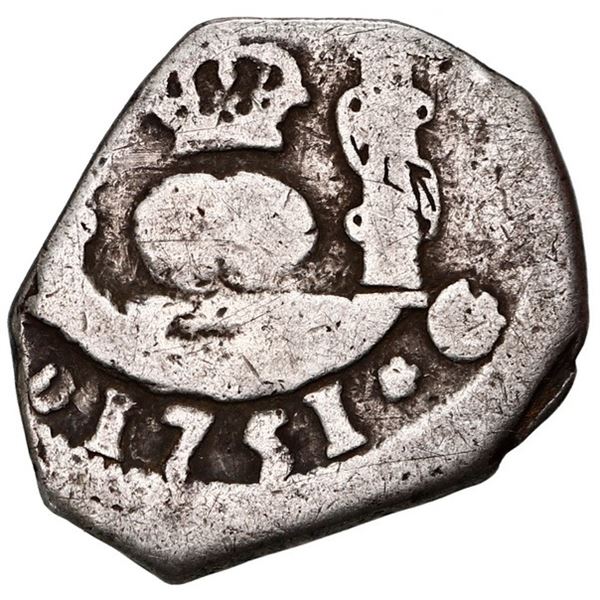 Guatemala, cob 1 real, 1751 J. JP-1R19; S-G1a; Cal-130; KM-9. 3.20 grams. Fine with bold full date, scarce piece with no hole in it.