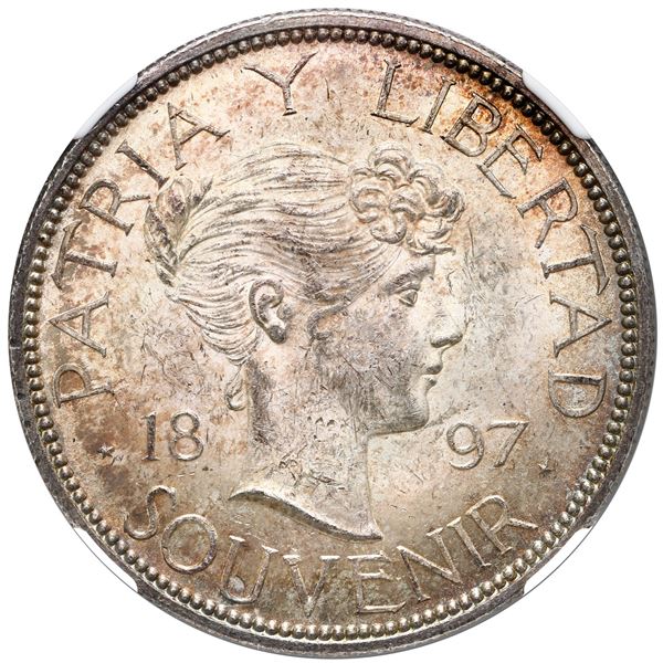 Cuba, "souvenir" peso, 1897, Type II (star below baseline of 97), NGC MS 61. KM-XM2. Lightly rainbow toned over cartwheel luster, lightly...