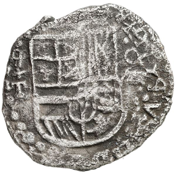 Potosi, Bolivia, cob 8 reales, Philip III, assayer T, upper half of shield transposed, Grade 3. S-P21; KM-10. 17.35 grams. Darkly toned, full shield a