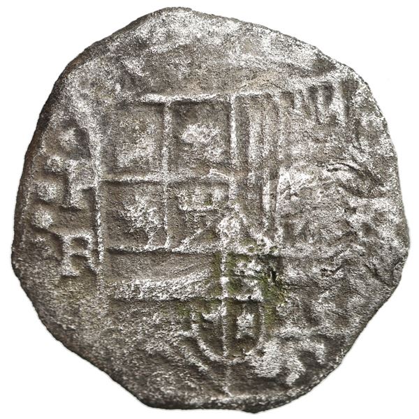 Potosi, Bolivia, cob 8 reales, Philip III, assayer not visible, Grade 2. KM-10. 18.57 grams. Silvery and thin from corrosion but with most of shield a