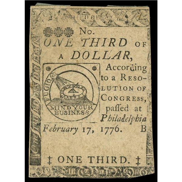1243 - Philadelphia, Continental Congress, $1/3, Feb. 17, 1776, serial not visible.Sedwick & Associates, LLC