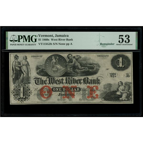 1253 - Jamaica, Vermont, West River Bank, $1 remainder, 1860s, PMG AU 53.Sedwick & Associates, LLC