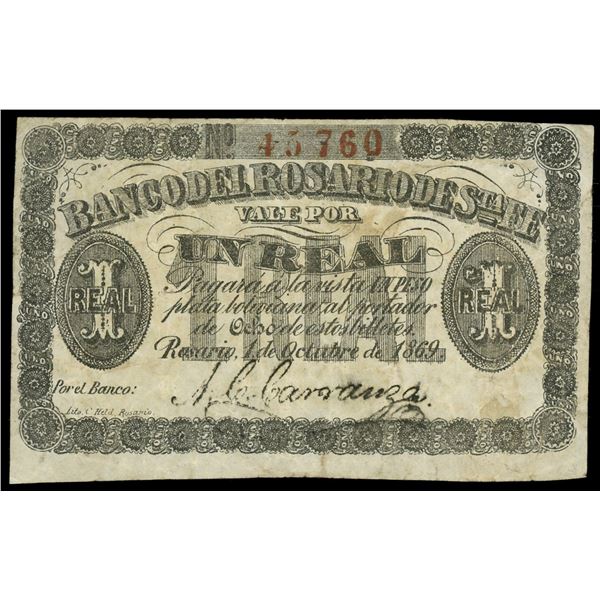 1257 - Rosario, Argentina, Banco del Rosario de Santa Fe, 1 real, 1-10-1869, serial 45760.Sedwick & Associates, LLC