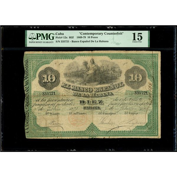 Cuba, Banco Espanol de la Habana, 10 pesos contemporary counterfeit, 7-2-1877, serial 335721, PMG Choice Fine 15. Pick-12x. There appear to be two si