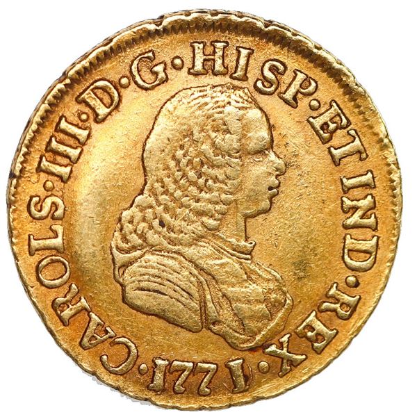 Popayan, Colombia, gold bust 2 escudos, Charles III (bust of Ferdinand VI), 1771/0 J. Restrepo-58.17; Cal-1625; KM-36.2; Fr-28. 6.74 grams. Lightly to